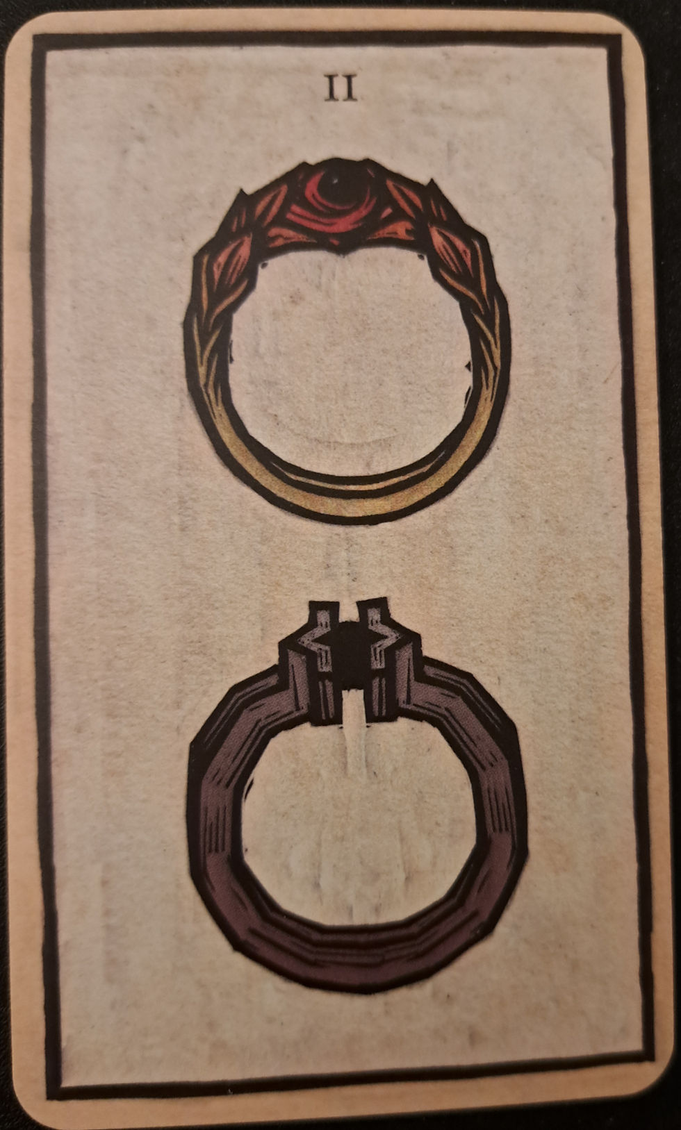 Within this deck, the suit of Rings is the alternative to Pentacles or Coins. It is rooted within the element of Earth so carries the energies of being grounded, creativity, rebirth, and new growth